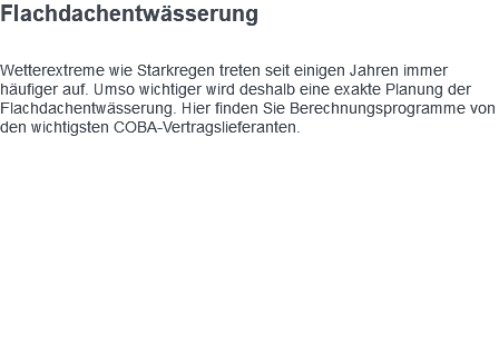 Berechnungsprogramme und Serviceseiten Hier finden Sie Berechnungsprogramme und weitere Serviceangebote von verschiedenen COBA-Vertragslieferanten. Klicken Sie einfach auf das Logo des Herstellers, um auf seiner Internetseite zu dem gewünschten Thema zu gelangen. Bitte beachten Sie, dass die COBA und die COBA-Fachhändler keine Haftung für eventuelle Eingabe- oder Berechnungsfehler und daraus entstehende Reklamationen übernehmen. Windsogberechnung In den letzten Jahren sind Wetterextreme wie zum Beispiel starke Stürme häufiger geworden. Darauf hat der Zentralverband des Deutschen Dachdeckerhandwerks reagiert und sein Regelwerk den erhöhten Anforderungen angepasst. So sind viele Dächer, die in der Vergangenheit keine spezielle Windsogsicherung benötigten, heute verstärkt zu befestigen. Hier finden Sie entsprechende Berechnungsprogramme der wichtigsten COBA-Vertragslieferanten. Schneelastberechnung Schneefangsysteme verhindern das Abrutschen von Schneemassen und Eis vom Dach. Um Schäden an geparkten Autos oder gar Verletzungen von Menschen zu verhindern, muss das Schneefangsystem richtig dimensioniert werden. Hier finden Sie entsprechende Berechnungsprogramme der wichtigsten COBA-Vertragslieferanten. Dacheinteilung Die Programme der hier aufgeführten Hersteller unterstützen Sie bei der Berechnung der Dachlatten- und Schnürabstände für die Dacheindeckung mit Ziegeln oder Betondachsteinen. Leistungs-/ Ausschreibungstexte Hier finden Sie Leistungs- bzw. Ausschreibungstexte für viele Produkte der wichtigsten COBA-Vertragslieferanten. Bemessungssoftware Verschiedene Hersteller von Befestigungs- und Verbindungsmitteln stellen Handwerkern und Planern Softwarelösungen zur Verfügung, mit denen Sie die Tragfähigkeit berechnen und die richtigen Produkte auswählen können. Hier finden Sie die Angebote der wichtigsten COBA-Vertragslieferanten. Flachdachentwässerung Wetterextreme wie Starkregen treten seit einigen Jahren immer häufiger auf. Umso wichtiger wird deshalb eine exakte Planung der Flachdachentwässerung. Hier finden Sie Berechnungsprogramme von den wichtigsten COBA-Vertragslieferanten. Berechnungen für Dämmstoffe Hier finden Sie Berechnungsprogramme zur U-Wert-Ermittlung (Isover, Ursa) sowie verschiedene Serviceangebote für Aufsparrendämmung (Wienerberger). Klicken Sie einfach auf das Logo des gewünschten Lieferanten, um zu seinen Berechnungsprogrammen zu gelangen. Fenster, Lichtkuppeln, Rauchabzüge Hier finden Sie verschiedene Serviceangebote für die Fenster- und Lüftungsplanung im Steil- und Flachdach sowie Bedienungs- und Montageanleitungen. Eine Kurzbeschreibung steht jeweils unter dem Logo des Lieferanten. Weitere Serviceprogramme Hier haben wir weitere Berechnungsprogramme und Planungshilfen für verschiedene Anwendungsbereiche sowie Verlegeanleitungen und Apps für Sie zusammengestellt. Eine Kurzbeschreibung sehen Sie jeweils unter dem Logo des Anbieters.
